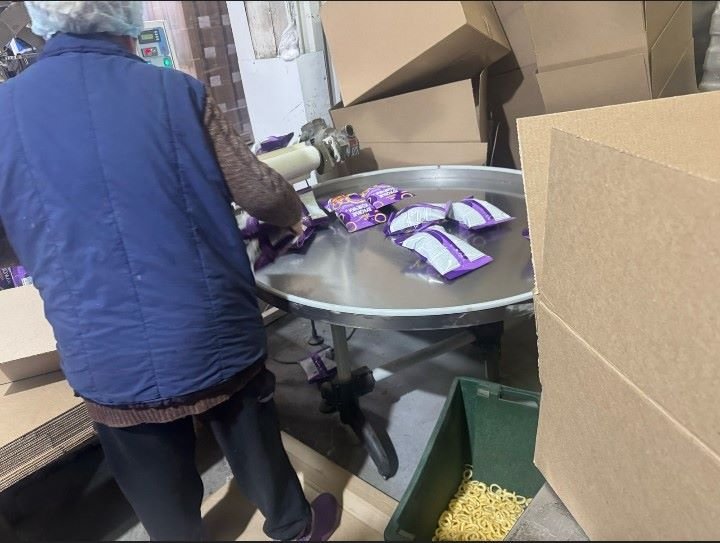 Упаковка, фасовка и маркировка чипсов, снэков, газировка. Мужчины могут везти на рохле газировку.